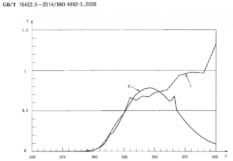 1B 型(UVA-351)熒光紫外燈:這種燈在300nm下的輻射低于總光能輸出的2%,在353nm有發(fā)射峰,用來模擬經窗玻璃后日光的紫外部分,這種燈通常被稱秋UVA-351(見表2)。附錄A中的圖A.2為250nm~400nm下典型的1B型(UVA-351)熒光燈對比經窗玻璃過濾后日光的光譜輻照度圖。2型(UVB-313)燈可在相關方協(xié)商同意下使用,但協(xié)商意見應在試驗報告中指出。