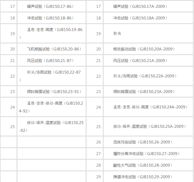 GJB 150A包含28個部分,前23個部分是對GJB 150全部25個規范的修訂。在修訂過程中刪除了GJB 150中的第6部分《軍用設備環境試驗方法-溫度-高度試驗》(GJB150.6-86)和第19部分《軍用設備環境試驗方法-溫度/濕度/高度試驗》(GJB 150.19-86)。因此,修訂后的GJB 150內容由25個部分變成了23個部分,每個部分的標準編號由GJB 150.XX-XX變為GJB 150.XXA-2009。GJB 150A的后5個部分,是新增加的內容,分別是《軍用裝備實驗室環境試驗方法-流體污染試驗》、《軍用裝備實驗室環境試驗方法-爆炸分離沖擊試驗》、《軍用裝備實驗室環境試驗方法-酸性大氣試驗》、《軍用裝備實驗室環境試驗方法-彈道沖擊試驗》和《軍用裝備實驗室環境試驗方法-艦船沖擊試驗》,標準編號分別為GJB 150.26-2009、GJB 150.27-2009、GJB 150.28-2009、GJB 150.29-2009,由于這些內容是新增加的、未經修訂,因此在標準編號仍然為GJB150.XX-2009,而不是GJB 150.XXA-2009。GJB 150與GJB150A的內容對比如表所示。